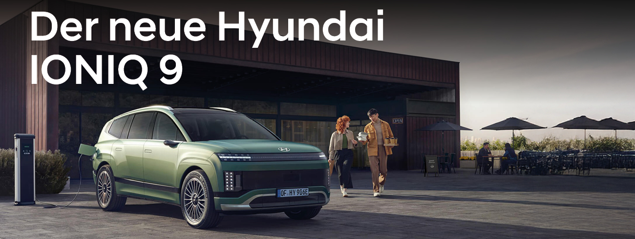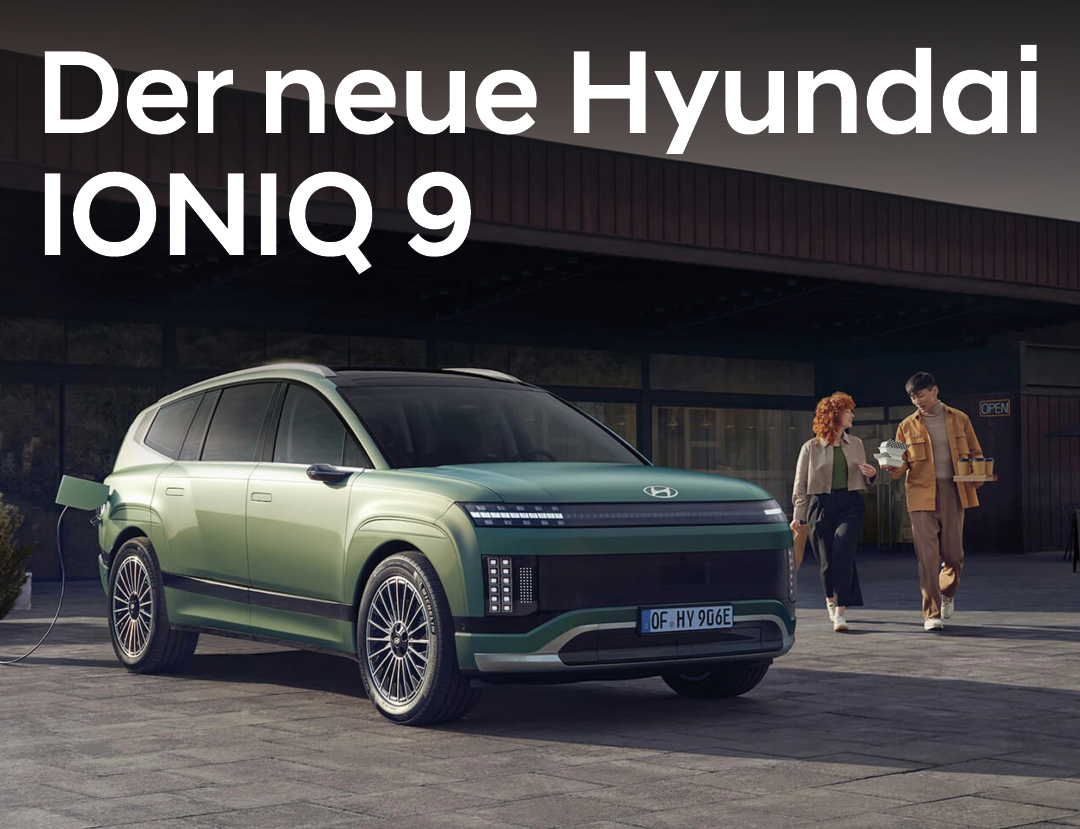 1) Ein unverbindliches Leasingbeispiel der HYUNDAI Finance, ein Geschäftsbereich der Hyundai Capital Bank Europe GmbH, Europa-Allee 22, 60327 Frankfurt am Main. Verbraucher haben ein gesetzliches Widerrufsrecht. Nach den Leasingbedingungen besteht die Verpflichtung zum Abschluss einer Vollkaskoversicherung. Hyundai IONIQ 9 160 kW (218 PS) 110 kWh-Batterie, Heckantrieb, einmalige Leasingsonderzahlung 0,00 EUR, Laufzeit 48 Monate, Gesamtlaufleistung 40.000 km. Kostenpflichtige Zusatzausstattung möglich. Zuzüglich Überführungskosten. Alle Preise inkl. gesetzlicher MwSt. Angebot gültig bis 31.12.2025.