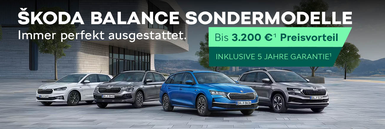 *Preisvorteil gegenüber der unverbindlichen Preisempfehlung der Škoda Auto Deutschland GmbH für vergleichbar ausgestattete Serienmodelle der Ausstattungslinie Selection und unter Berücksichtigung der 36-monatigen Garantieverlängerung (Gesamtfahrleistung 50.000 km). Die Höhe des Preisvorteils bestimmt sich nach dem jeweiligen Balance Sondermodell (Fabia, Scala, Kamiq, Karoq, Octavia oder Octavia Combi).