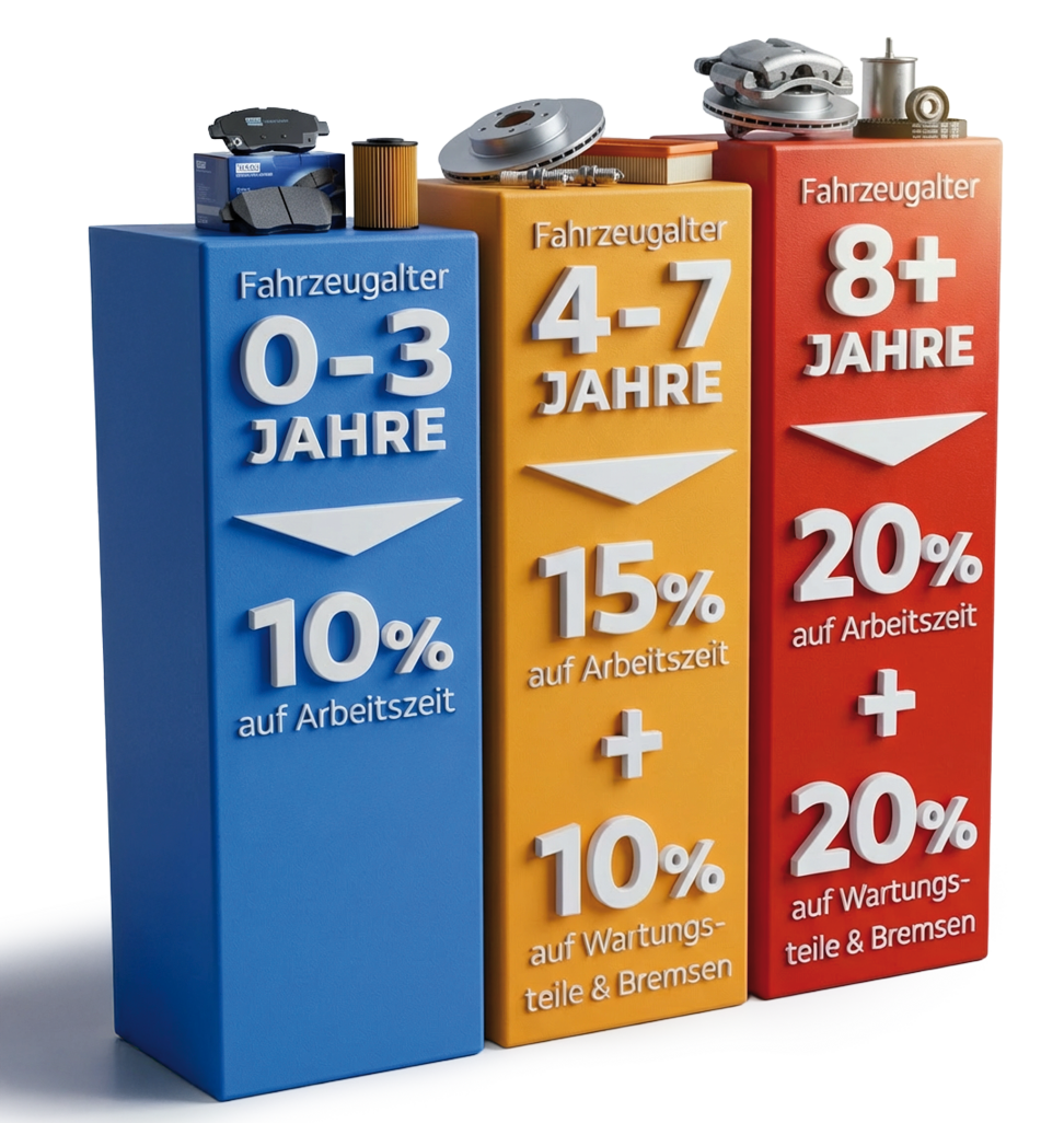 Als Tönnemann Kunde erhalten Sie je nach Fahrzeugalter einen Rabatt auf Inspektion und Bremsen.